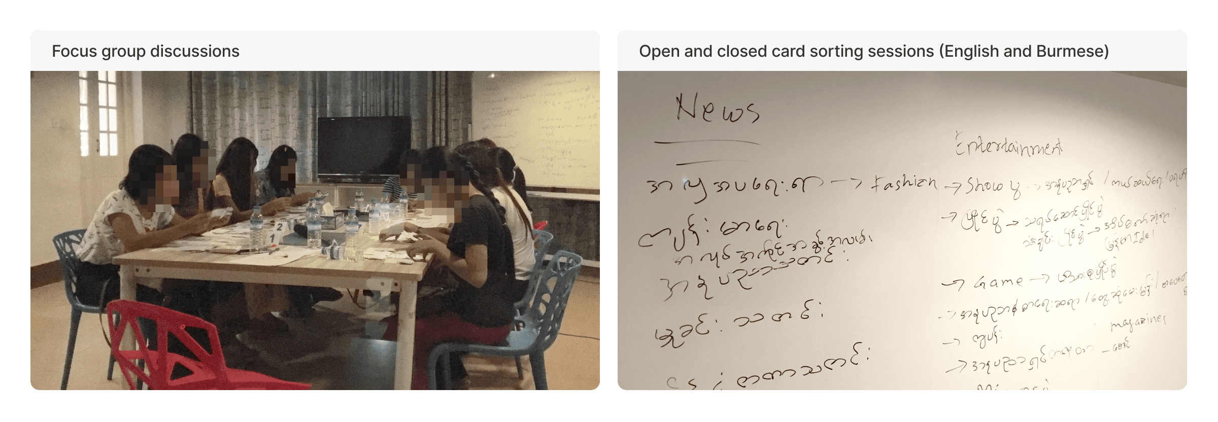 Open and closed sessions to inform information architecture and content strategy — including contextual use of English versus Burmese